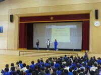 5月19日(月)に児童朝会が行われました。今日の児童朝会では、児童会スローガンと運動会スローガンの発表がありました。