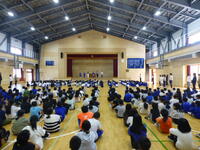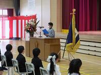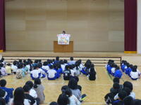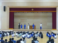 6月6日(木)にプール開きの全校朝会が開かれました。初めに各学年の代表がそれぞれめあてを発表しました。低学年は「目を開けてジャンケンをする」「宝探しゲームで宝をたくさん取る」など、高学年は「クロールで35メートル泳ぐ」「平泳ぎで25メートル泳ぐ」などめあてが発表されました。